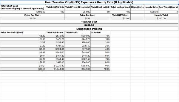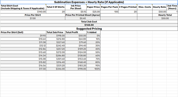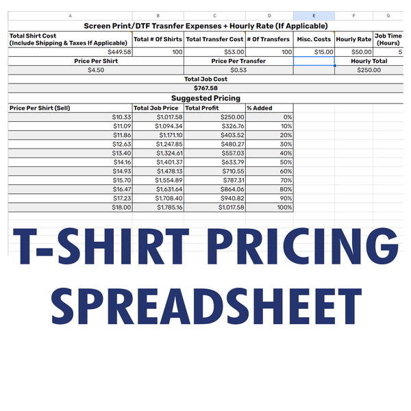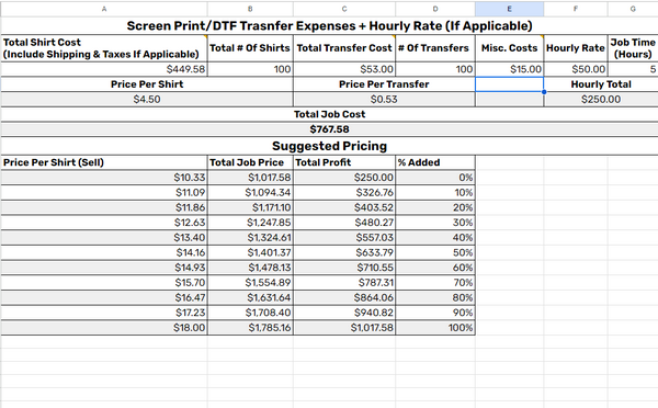 This sheet can help you price your shirts by the hour, or simply by percentages. With it, you also get the ability to price shirts you print using: